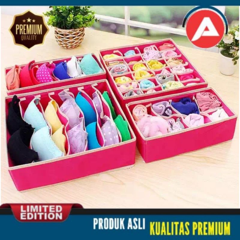 [4in1] Underwear Storage Box | Tempat Penyimpanan Pakaian DalamDeskripsi USB004 - 4 in 1 Underwear Storage Box tanpa Tutup (1pc dpt 4 box) - BeigeUSB004 - 4 in 1 Underwear Storage Box tanpa Tutup (1pc dpt 4 boxREADY :* FUCHSIA* BEIGEKOSONG :Tulis pilihan warna di kolom catatan / keterangan. Tanpa keterangan akan kami kirim random.Pilihan warna akan dikirim sesuai variasi yang dipilih ketika order. Mohon maaf tidak menerima perubahan variasi warna dari diskusi atau pesan. Jika warna yang dipilih habis maka akan kami kirim warna yang ready tanpa konfirmasi terlebih dahulu. Beli = Setuju.* Warna sesungguhnya mungkin dapat berbeda. Hal ini dikarenakan setiap layar memiliki kemampuan yang berbeda-beda untuk menampilkan warna, kami tidak dapat menjamin bahwa warna yang Anda lihat adalah warna akurat dari produk Pilihan warna akan dikirim sesuai variasi yang dipilih ketika order. Mohon maaf tidak menerima perubahan variasi warna dari chat atau pesan. Jika warna yang diminta habis maka akan kami kirim sesuai warna yang ready."CACAT MINOR ADALAH WAJAR KARENA PRODUKSI MASAL. APABILA INGIN DITUKAR ONGKOS KIRIM PENUKARAN PP DITANGGUNG PEMBELI"Setiap set terdiri dari 4 box beda ukuran (please allow slight variation on the measurement).Box 24 ruang tanpa tutup : 33 cm x 30 cm x 10.5 cmBox 8 ruang tanpa tutup : 29 cm x 16 cm x 10.5 cmBox 7 ruang tanpa tutup : 33 cm x 30 cm x 10.5 cmBox 6 ruang tanpa tutup : 33 cm x 16 cm x 10.5 cmMaterial : non woven fabric dengan karton tebalTempat penyimpanan 4 in 1 yang dapat digunakan untuk tempat menyimpan pakaian dalam dan pernak-pernik lainnya..Multifunction box membantu merapikan isi rumah yang berserakan. Design praktis dan modern, mudah disimpan. Pada bagian tutup terdapat perekat jenis ve